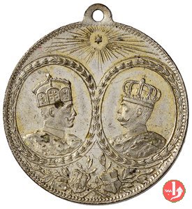 Reali di Germania per le Nozze d'Argento Dritto: busti del Re e della Regina a sx tra due angeli che reggono rami di palma e corona Verso: nel campo: ALLE LORO = MAESTA' IMPERIALI = DI GERMANIA UN = CORDIALE BENVENUTO = IN ITALIA = RICORDO PER LE = NOZZE D'ERGENTO = DEI REALI D'ITALIA = 22. 4. 1898. | |