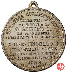 Visita dell'Imperatore Guglielmo II 33mm Dritto: sormontati da stella raggiante: Busti affrontati e coronati entro ovali a foglie d'alloro di Guglielmo II e Umberto I con mantelli d'ermellino in basso: Stemmi su rami d'alloro dell'Impero di Germania e del Regno d'Italia nel campo: DELLA VISITA = DI S:M: J: E R: = GUGLIELMO II = RE DI PRUSSIA = IMPERATORE DI GERMANIA = A = S: M: R: UMBERTO I = RE D' JTALIA A ROMA = CAPITALE DEL REGNO = IL GIORNO 11 OTTOBRE = 1888 in basso, circolarmente: ROMA INTANGIBILE | |