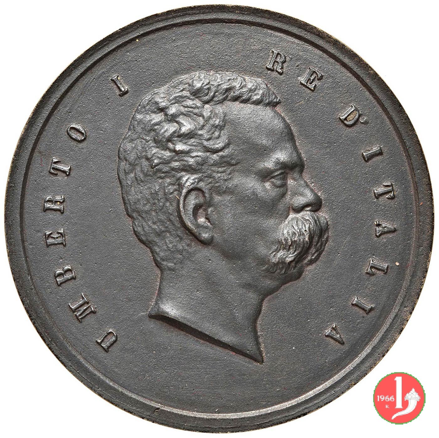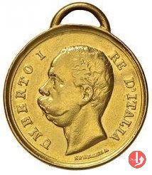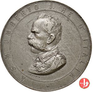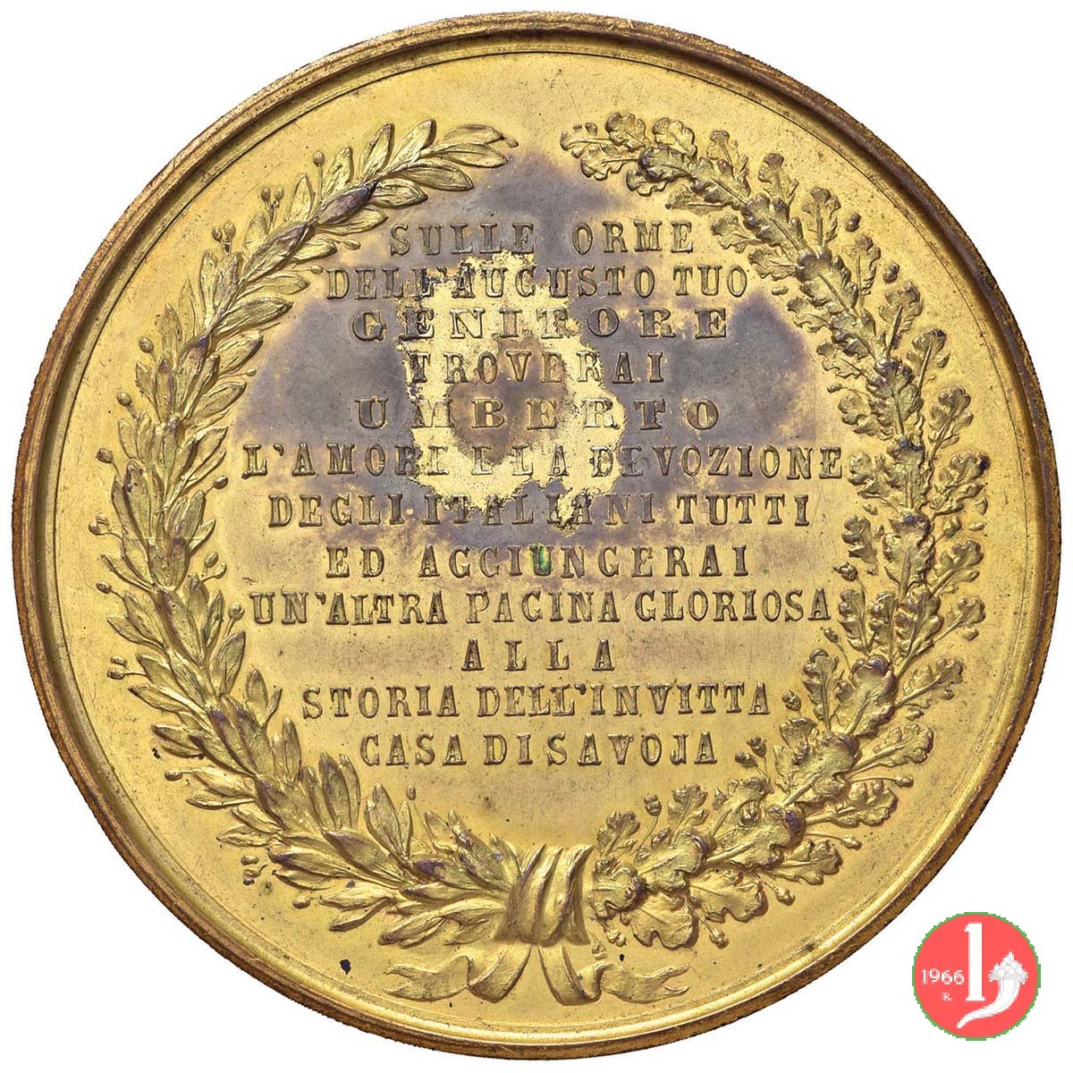 Ascesa al Trono - U coronata Dritto: A S. M. UMBERTO I RE D' ITALIA busto a sx con uniforme e collare della SS. Annunziata sotto: L. INSENGA entro cerchio perlinato: U contenente 1° coronata tra rami d'alloro legati da nastro in basso | |