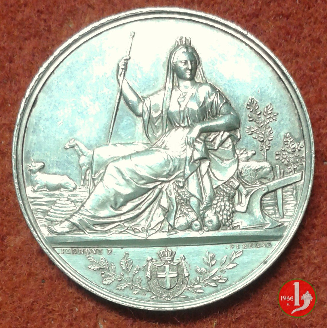 Cooperazione alla Inchiesta Agraria 1880 Dritto: Figura allegorica dell'Italia turrita seduta verso sx e volta di fronte regge asta, tra un bue ed un cavallo da un lato e frutta e aratro dall'altro Sotto la linea dell'esergo: PIERONI _ FIRENZE in esergo: stemma Savoia coronato ed entro panneggio tra rami d'alloro e quercia | |