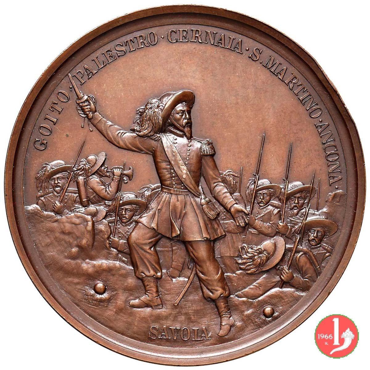 La Marmora - Corpo dei Bersaglieri Dritto: AD ALESSANDRO LA MARMORA I BERSAGLIERI busto a dx del Gen. La Marmora in divisa sotto:PRIMO CINQUANTENARIO = DELLA ISTITUZIONE DEL CORPO = XVIII GIUGNO MDCCCLXXXVI Il Generale, entro campo di Battaglia, con spada verso sx sotto: SAVOIA | |
