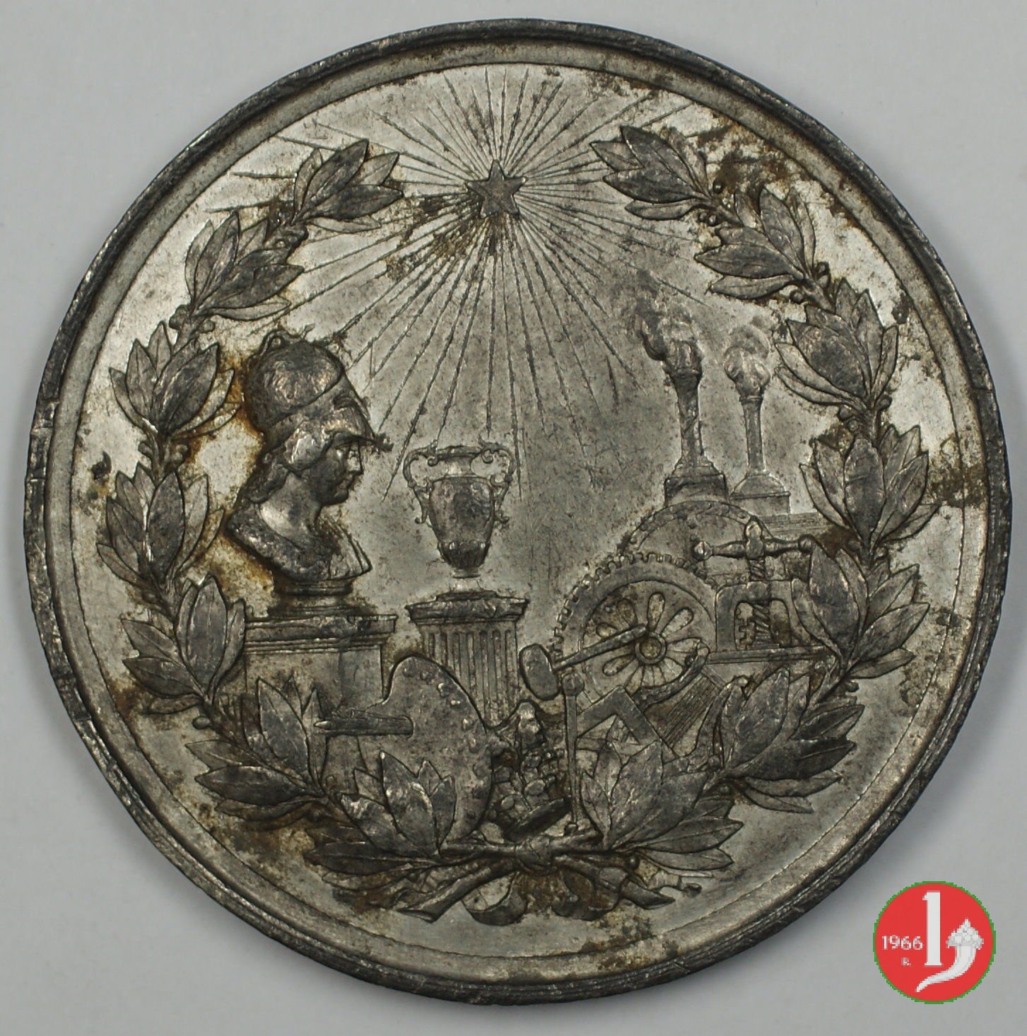 Esposizione Nazionale a Milano 1881 Dritto: UMBERTO I _ RE D'ITALIA busto nudo a sx sotto: F. BARZAGHI MOD. _ F. BROGGI INC. Oggetti e prodotti esposti dell'esposizione (incudine, tenaglia, torchio, alambicco, accetta, ruota dentata, pila, caduceo, ciminiera, falce, squadra e fili del telegrafo) con spighe di grano e rami con bozzoli da seta disposti circolarmente, avvolti da nastro con ARTI _ COMMERCIO _ INDUSTRIE _ SCIENZE sormontati da stella raggiante e con al centro spazio per dedica | |