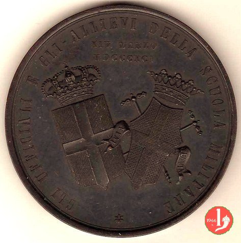 Ufficiali e allievi Scuola Militare di Modena Dritto: GLI UFFICIALI E GLI ALLIEVI DELLA SCUOLA MILITARE Stemmi affiancati e coronati dei Savoia e della Scuola militare di Modena nel campo in alto: XIV MARZO = MDCCCXCI sotto: * presso il nastro: L. BROGGI F _ A MILANO | |