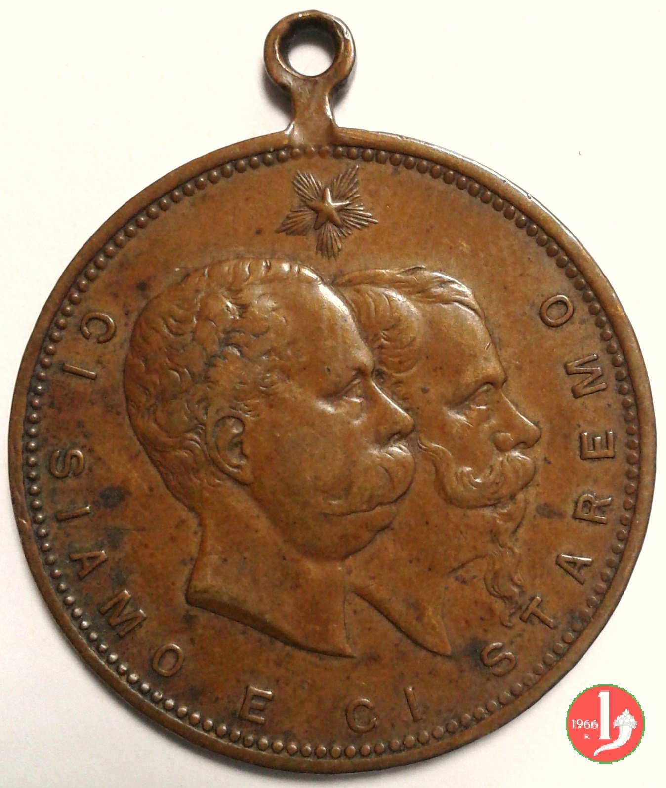 Alleanza con la Germania 39mm Dritto: UMBERTO I. * RE D'ITALIA entro cerchio perlinato e cornice: busto con uniforme, collare della SS. Annunziata, decorazioni e cappotto a dx sotto: Stemmi affiancati su rami d'alloro e quercia entro cerchio perlinato e cornice: busto di Guglielmo a sx con uniforme, decorazioni e mantello in basso, entro nastro: SEMPRE AVANTI SAVOIA 1889 | |