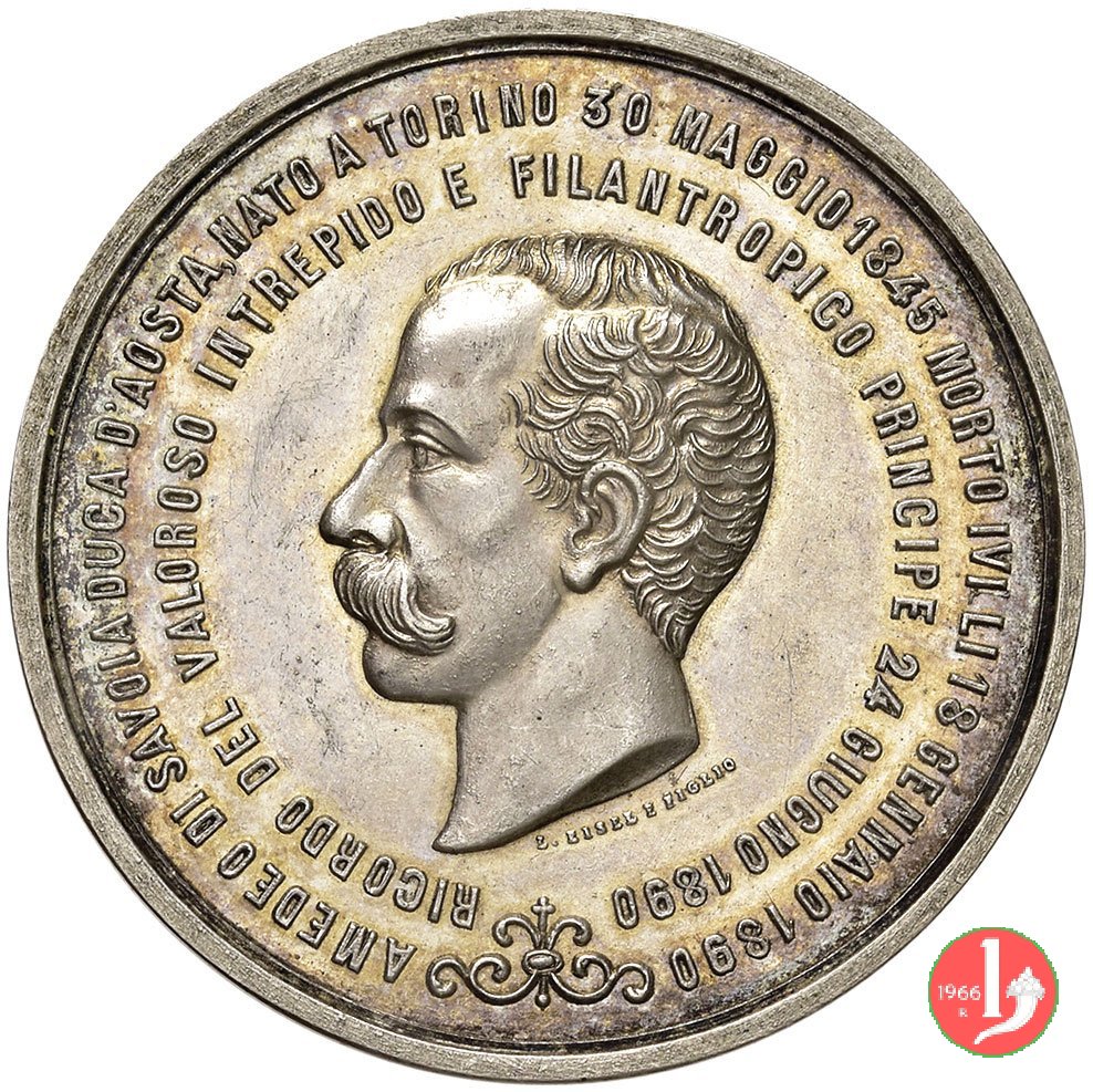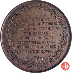 Morte di Amedeo di Savoia 40mm Dritto: nel giro, su due righe concentriche: AMEDEO DI SAVOIA DUCA DAOSTA. NATO A TORINO 30 MAGGIO 1845 MORTO IVI IL 18 GENNAIO 1890 RICORDO DEL VALOROSO INTREPIDO E FILANTROPICO PRINCIPE 24 GIUGNO 1890 testa a sx del principe sotto: L. EISEL E FIGLIO In basso: fregio Nel campo, entro rami d'alloro e di quercia, legati in basso da nastro: CUSTOZA = MADRID = BUSCA = NAPOLI | |