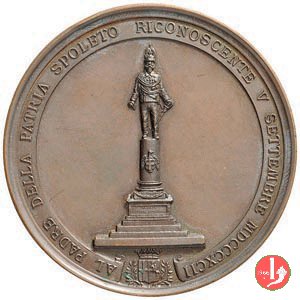 Visita a Spoleto-Monumento a VE II 05-09-1892 Dritto: I SOVRANI D'ITALIA AUSPICI DEI PATRII DESTINI DEVOTA LA CITTA' SALUTA * Putto, tra rami di quercia, sormontato da stella raggiante, in piedi, di fronte, regge serto d'alloro su cimiero posto alla sommità di una semicolonna recante stemma Savoia e medaglione con i busti accollati a sx di Umberto I e Margherita in esergo: A. GEMMA _ SPOLETO Prospetto anteriore del Monumento a Vittorio Emanuele II in basso: Stemma coronato della Città tra rami d'alloro | |