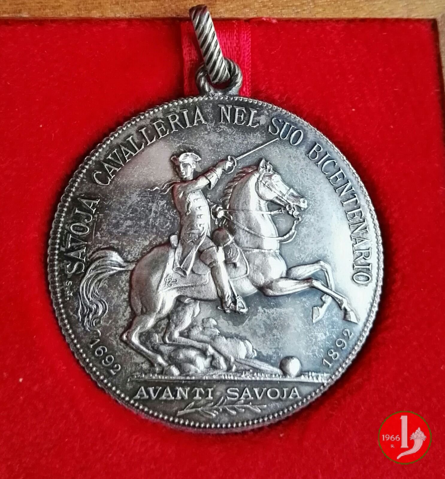 Bicentenario della Savoia Cavalleria Dritto: SAVOIA CAVALLERIA NEL SUO BICENTENARIO Cavallo rampante verso dx in basso ai lati: 1692 _ 1892 in esergo: AVANTI SAVOIA = ramo d'alloro in basso, a sx: JOHNSON - MILANO | |