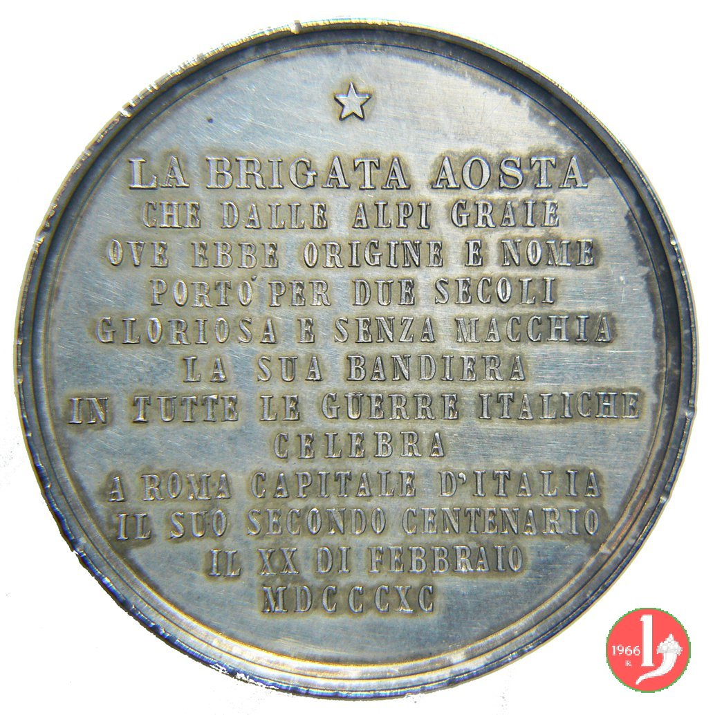 La Brigata Aosta 68mm Dritto: UMBERTO I _ VITTORIO AMEDEO II Busti accollati a dx, in uniforme militare Sotto: lo stemma Reale di Savoia, fra nodi d' amore nel campo a sx: Johnson Milano sotto, del campo: una carica a sx di dragoni Nizza. in esergo: targa accartocciata, sormontata da elmo fra quattro lance decussate, recante: 1690 1890 a sx: Pogliaghi mod.; a dx | |
