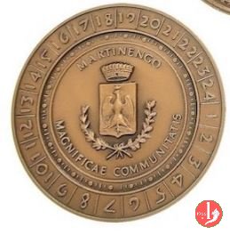 Martinengo - Natale Morzenti Dritto: NATALE _ MORZENTI busto di fronte con camicia nel campo a dx: 1885 = 1947 in basso a sx presso il bordo: D entro doppia cornice circolare continua con perline e tratti al centro: MARTINENGO _ MAGNIFICAE COMUNITATIS Stemma turrito di Martinengo tra rami d'alloro | |