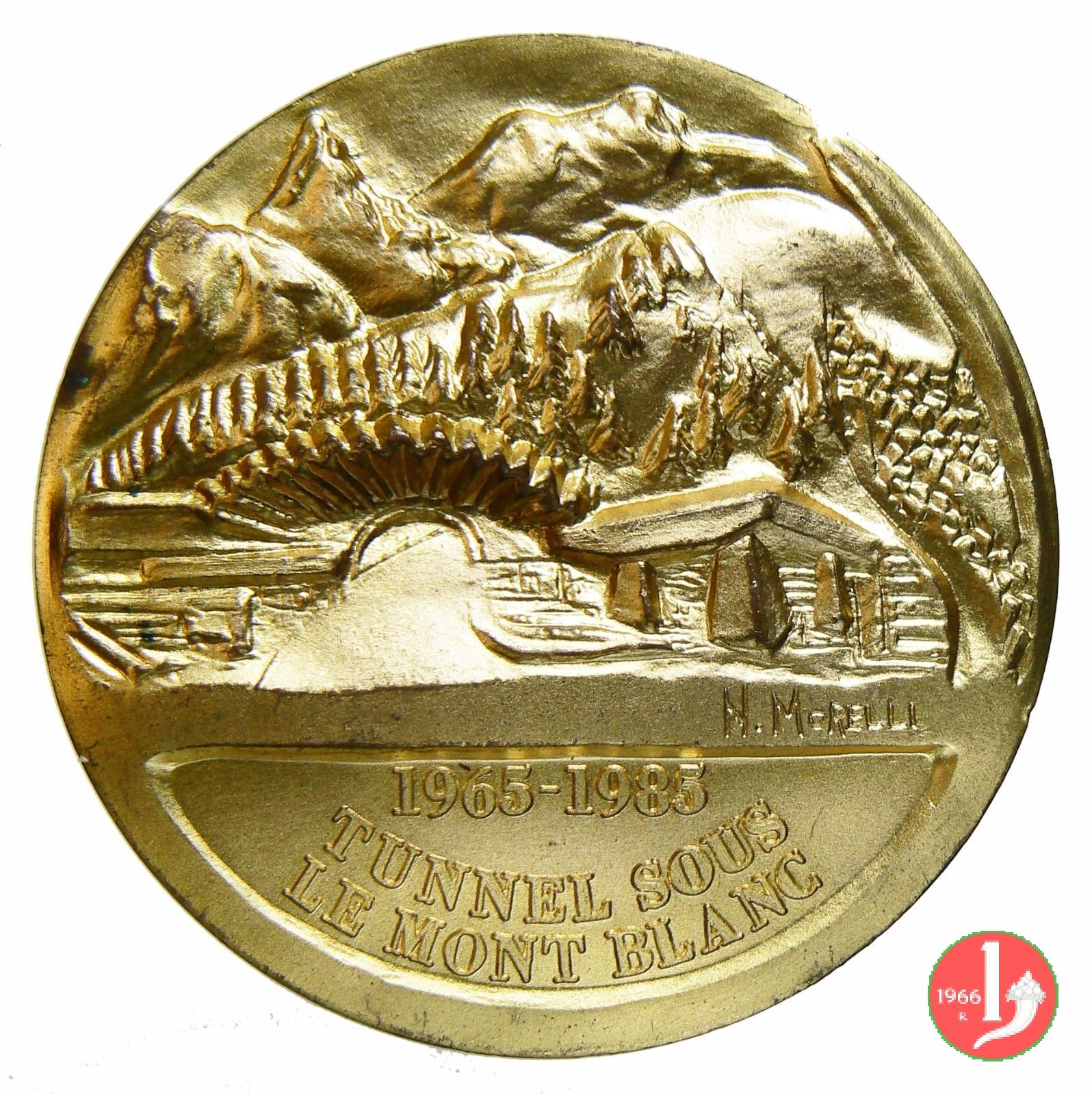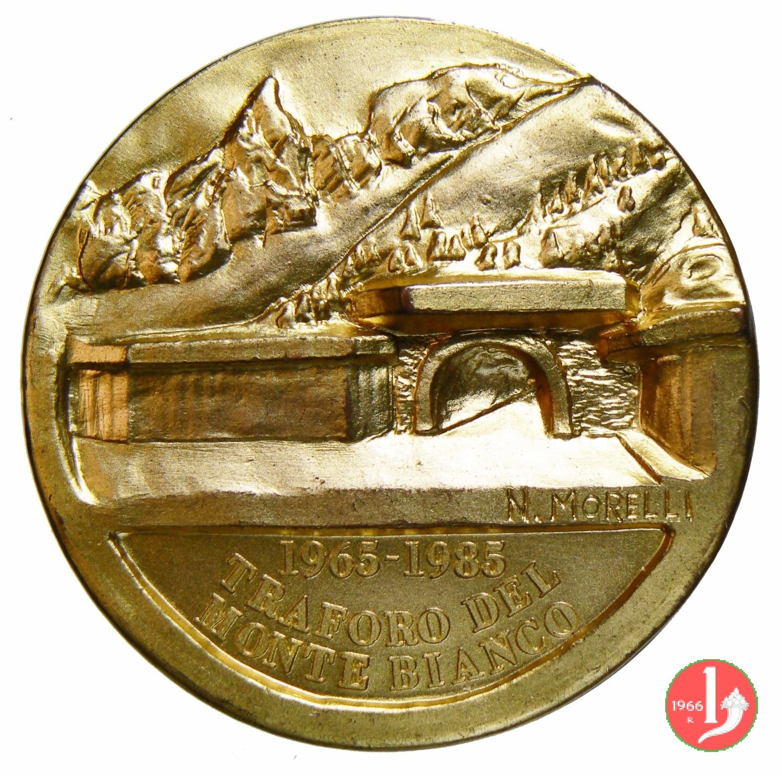 20° Traforo del Monte Bianco 1985 Dritto: Vista dell'Ingresso del Traforo del Monte Bianco, lato Italia (del 1985) sulla linea dell'esergo a dx: N. MORELLI in esergo: 1965-1985 = TRAFORO DEL = MONTE BIANCO sulla linea dell'esergo a dx: N. MORELLI in esergo: 1965-1985 = TUNNEL SOUS = LE MONT BLANC | |
