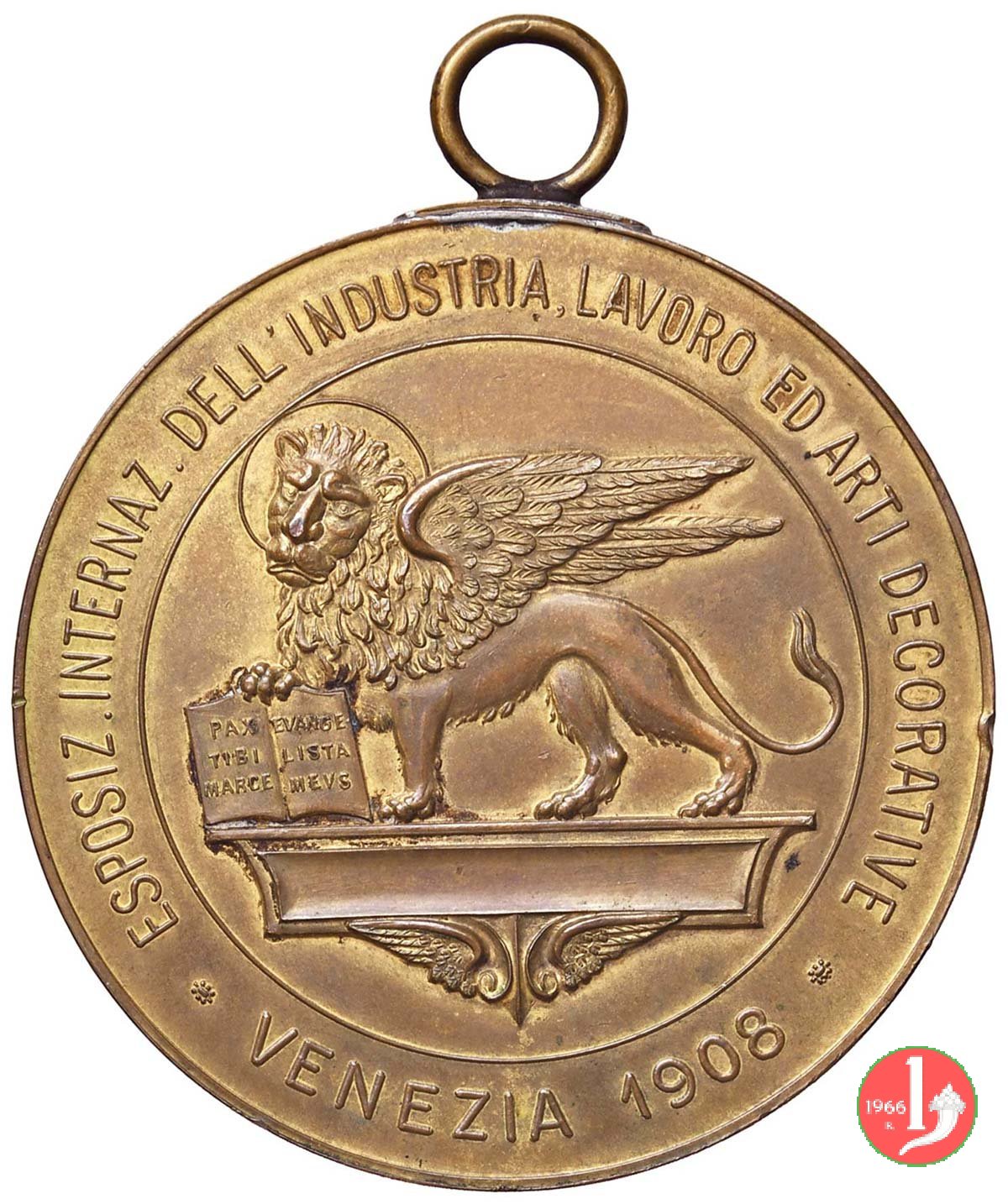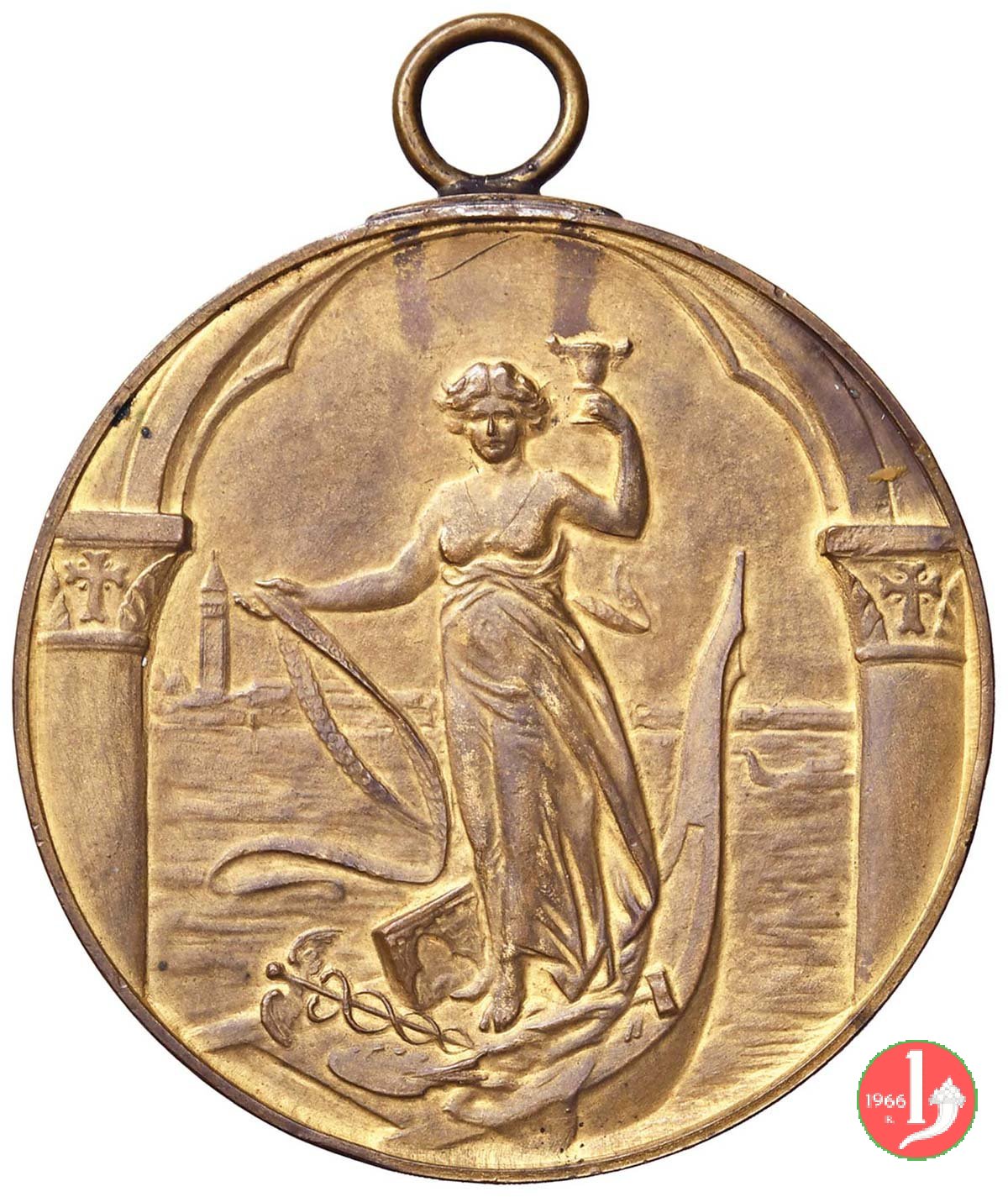 Esposizione Internazionale Industria Lavoro e Arti 1908 Dritto: figura allegorica di Venezia su gondola, entro arcata gotica, regge calice e nastro; ai suoi piedi caduceo, tavolozza con pennelli e martello Verso: ESPOSIZ. INTERNAZ. INDUSTRIA, LAVORO ED ARTI DECORATIVE = * VENEZIA 1908 * Leone di San Marco nimbato e volto a sx, regge Vangelo su mensola alata | |