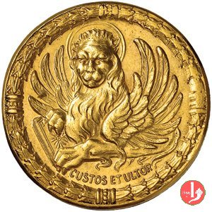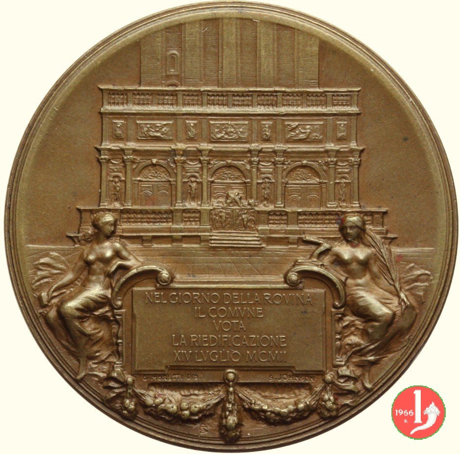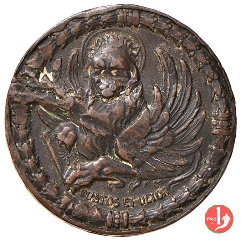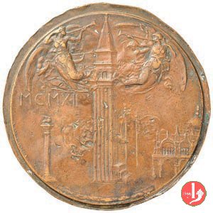 1912 Ricostruzione Campanile di S. Marco 38mm Dritto: VENEZIA • AL • SVONO • DELL'ANTICA • SQUILLA • ESVLTA Leone di San Marco in volo verso dx sul Canal Grande e sullo sfondo Piazza San Marco col campanile nel campo, a sx: • 14 • = LVGLIO = 1902 nel campo, a dx: • 25 • = APRILE = 1912 sotto, entro cartiglio retto da festoni: POST • FATA • RESVRGO | |