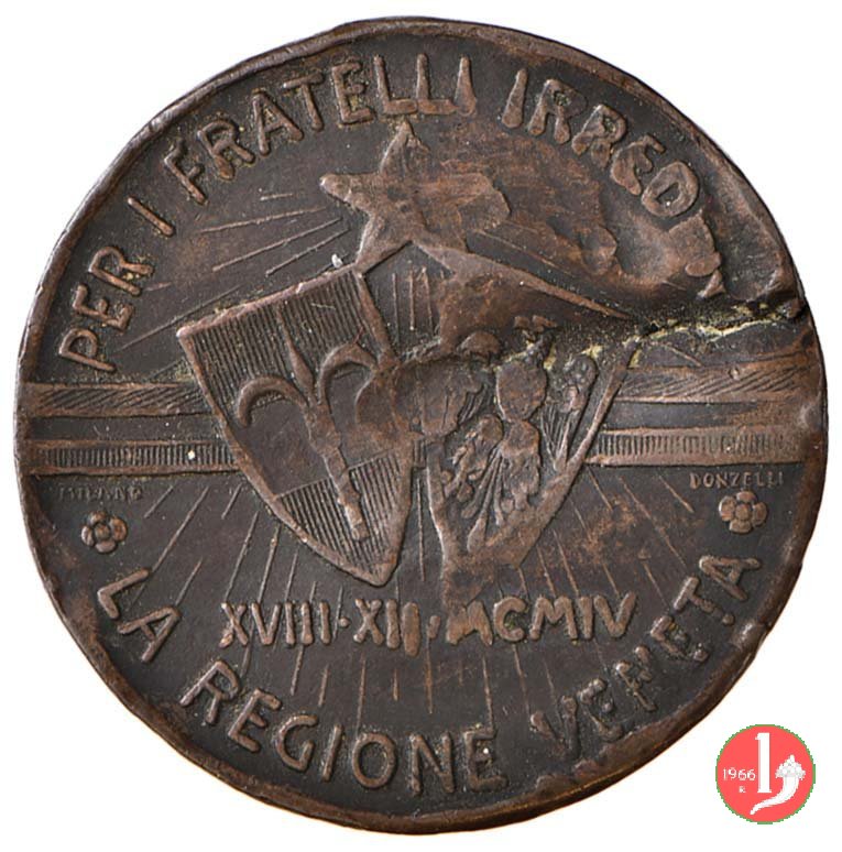 Ai Fratelli Irredenti - Trento e Trieste 1904 Dritto: entro ghirlanda d'alloro: leone di San Marco nimbato ed assiso a sx sotto: CUSTOS ET ULTOR su nastro tricolore orizzontale e irraggiati dall'alto da stella: Stemmi affiancati di Trento e Trieste sotto: XVIII • XII • MCMIV ai lati: MILANO _ DONZELLI | |