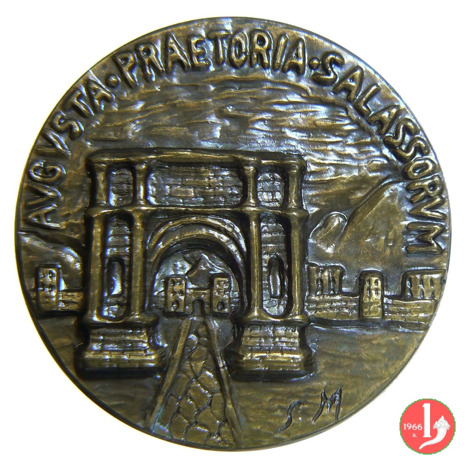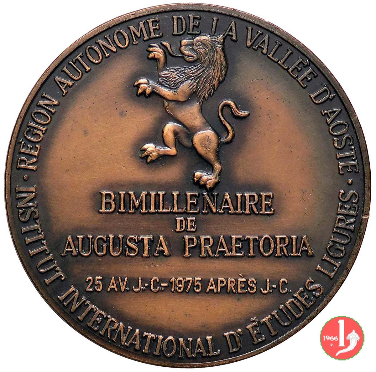 Bimillenario Augusta Praetoria 1975 Dritto: REGION AUTONOME DE LA VALLEE' D'AOSTE = • ISTITUT INTERNATIONAL D'ETUDES LIGURES • leone rampante a sx sotto: BIMILLENAIER = DE = AUGUSTA PRAETORIA = 25 AV J.C. - 1975 APRES J.C. Prospetto anteriore dell'Arco di Augusto ad Aosta sotto: BIMILLENARIO = DI = AUGUSTA PRAETORIA = 25 A.C. - 1975 D.C. | |
