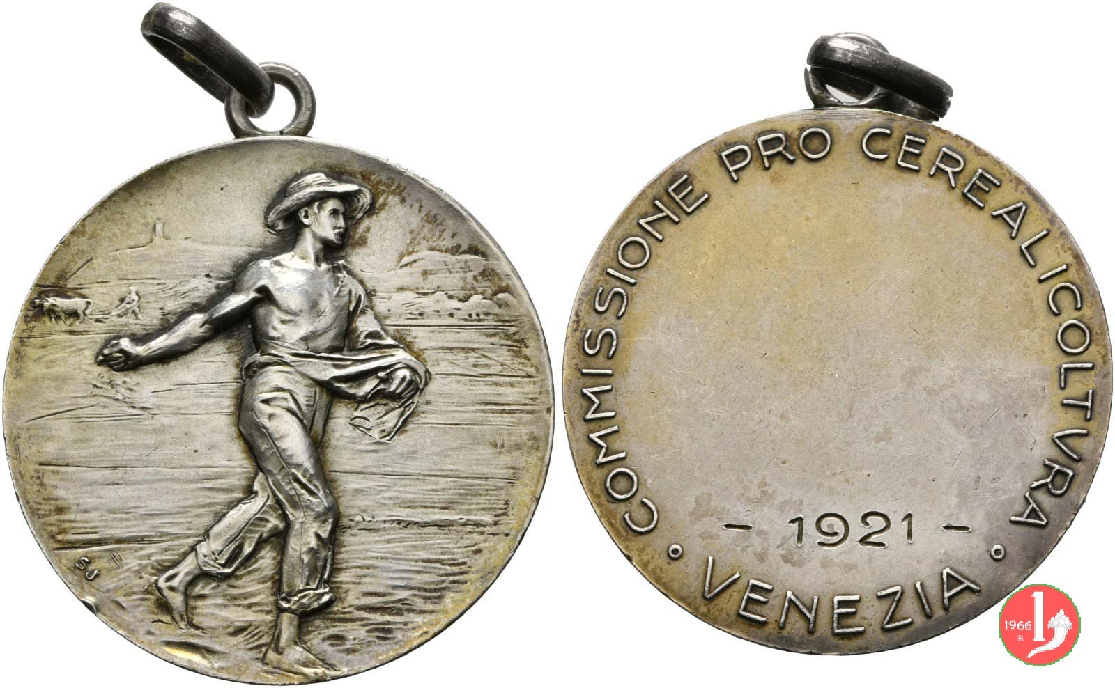 Commissione Pro Cerealicoltura (1921) Dritto: Contadino gradiente a dx con cappello, intento a seminare in campo, sullo sfondo a sx biga di buoi traina aratro in basso a sx: SJ nel campo spazio per dedica e anno | |