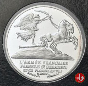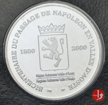 200° Napoleone in Val d'Aosta 2000 Dritto: la figura allegorica della Vittoria alata, volta a dx sul Gran San Bernardo, regge briglie di biga in esergo: L’ARMEE FRANCAISE = PASSE LE St. BERNARD = XXVIII FLOREALAN VIII = MDCCC sotto circolarmente: DUBOIS F _ DENON D. Stemma coronato della Val D'Aosta (leone rampante a sx) ai lati: 1800 _ 2000 sotto: REGIONE AUTONOMA VALLE D'AOSTA (ripetuto in francese) | |