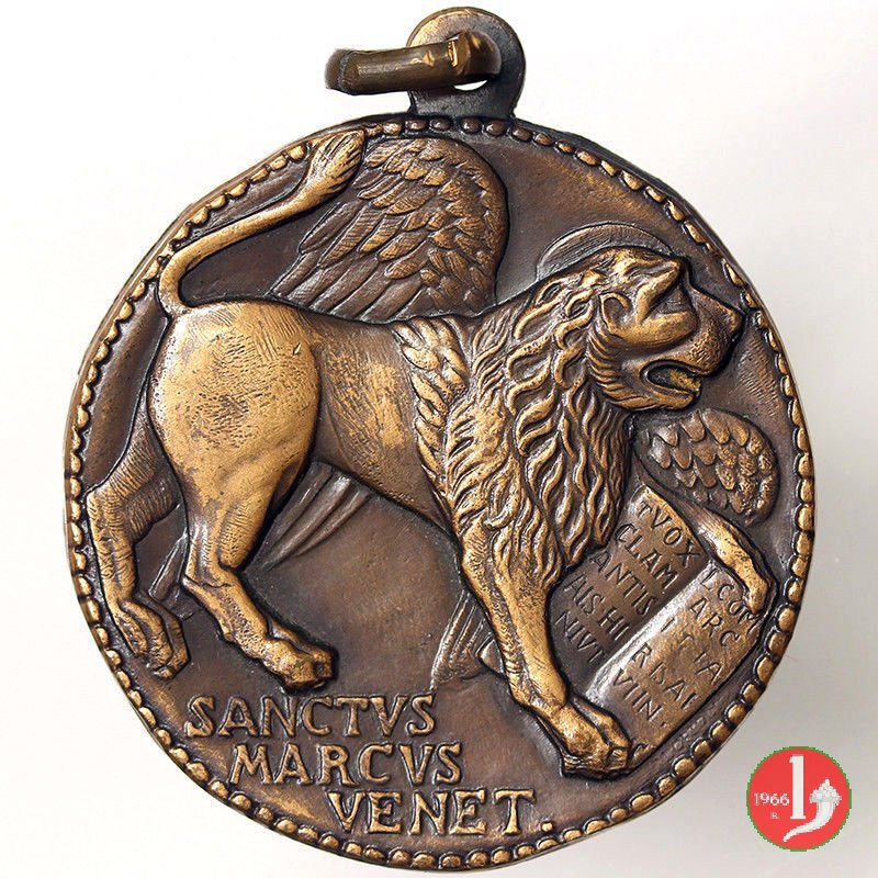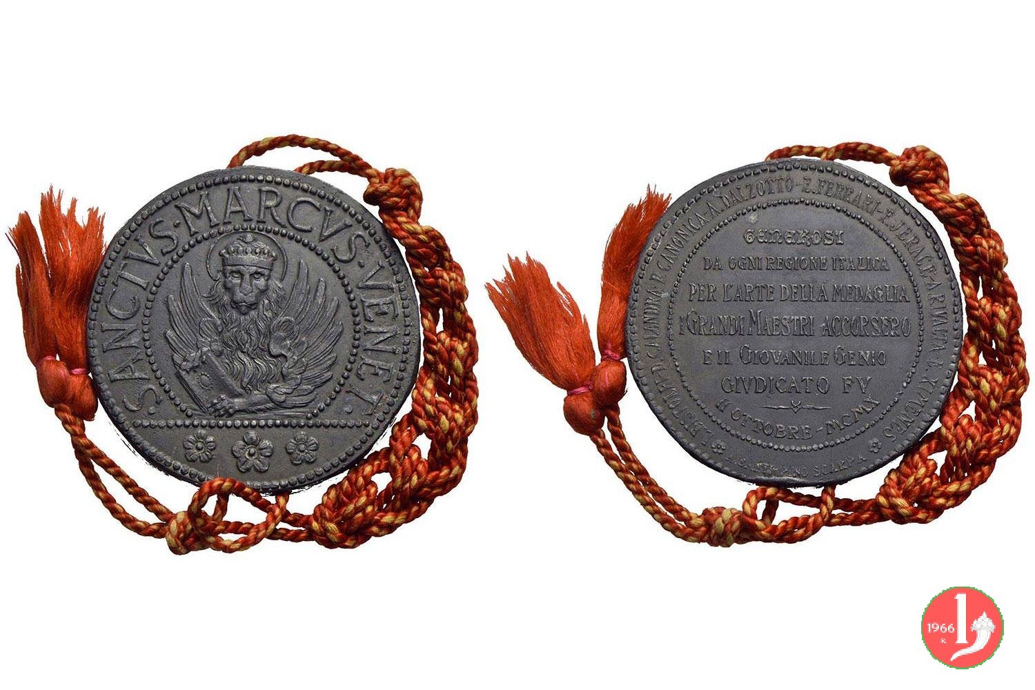 Concorso per l'Arte della Medaglia 1910 Dritto: SANCTVS • MARCVS • VENET entro cornice perlinata circolare, interrotta in basso da esergo perlinato: Leone di San Marco nimbato, regge Vangelo in esergo: tre margherite entro cornice circolare perlinata: GENEROSI = DA OGNI REGIONE ITALICA = PER L'ARTE DELLA MEGLIA = I GRANDI MAESTRI ACCORSERO = E IL GIOVANE GENIO = GIVDICATO FV = - sotto circolarmente: II OTTOBRE MCMX in basso circolarmente: A. SANTI - PINO SCARPA | |