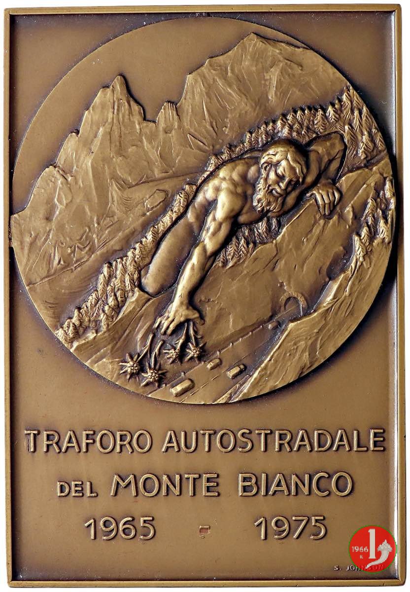 Inaugurazione Traforo del Monte Bianco 1965 Dritto: Vista panoramica del Traforo con l'imbocco del Tunnel dall'Italia e figura maschile distesa, allegorica del Monte Bianco, spande stelle alpine sulla strada in basso: E.MONTI _ SJ nel campo: GIUSEPPE SARAGAT = E = CHARLES DE GAULLE = INAUGURANO = IL PIU' LUNGO TUNNEL AUTOSTRADALE = DEL MONDO = SOTTO LA PIU' ALTA VETTA = DEL CONTINENTE = PER I TRAFFICI DI PACE = IN UN'EUROPA UNITA = 16 LUGLIO 1965 in basso: S. JOHNSON | |