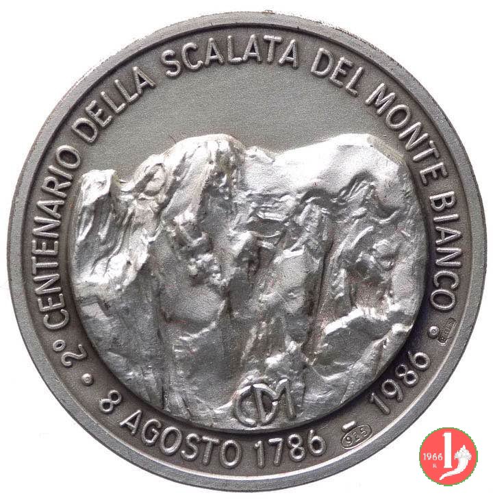 200° Conquista del Monte Bianco 1986 Dritto: in alto: 1786 entro quadrato in rilievo: MONTE BIANCO vista della vetta del Monte Bianco in esergo: 1986 nel campo a dx: stemma della Val d'Aosta | |