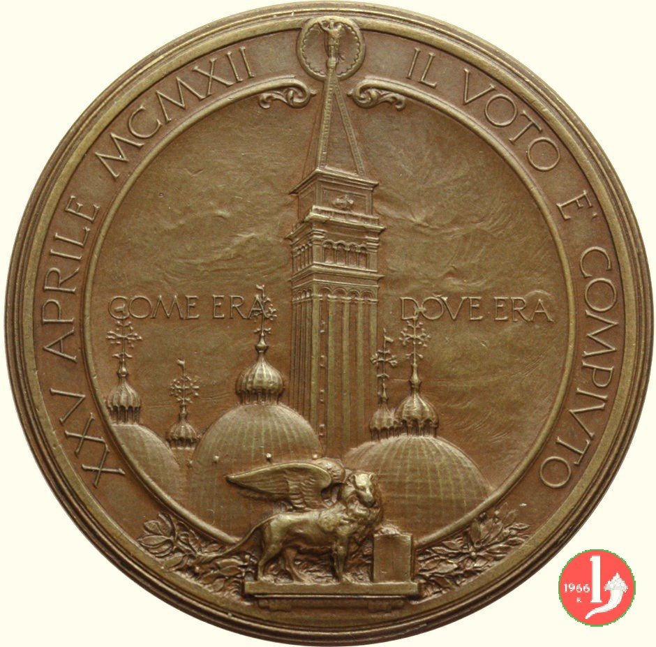 1912 Ricostruzione Campanile di S. Marco Dritto: IL VOTO E' COMPIVTO _ XXV APRILE MCMXII Vista del Campanile tra le cupole della Basilica di San Marco ai lati: COM'ERA _ DOV'ERA sotto: Leone di San Marco verso dx, tra rami d'alloro sotto, entro targa, tra due figure femminili, decorato da festoni in basso: NEL GIORNO DELLA ROVINA = IL COMUNE = VOTA = LA RIEDIFICAZIONE = XIV LUGLIO MCMII sul riquadro esterno della targa: G. MORETTI DIS. _ S. JOHNSON in basso, sotto ai festoni: E. SAROLDI MOD. _ A. CAPPUCCIO INC. | |
