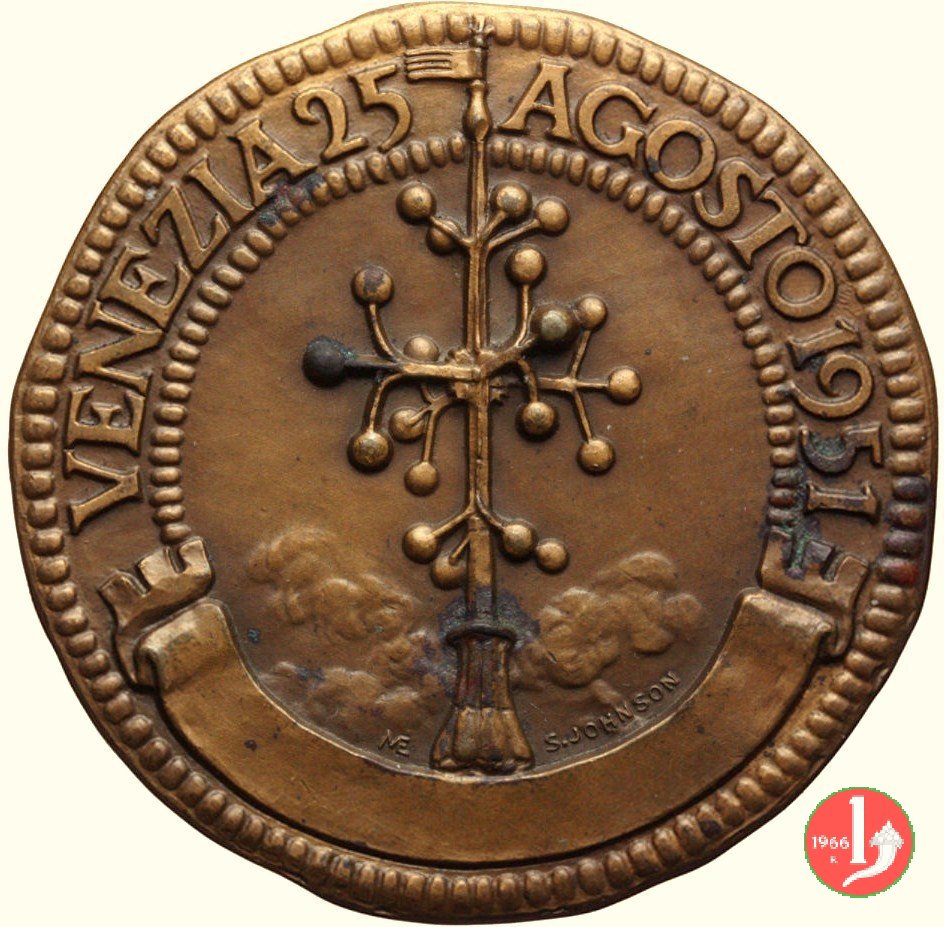 Palazzo Grassi - Centro Internazionale delle Arti e del Costume 1951 Dritto: VENEZIA 25 _ AGOSTO 1951 Pinnacolo della Basilica di San Marco (logo del Centro) in basso, a sx: ME in basso a dx: S. Johnson Prospetto anteriore di Palazzo Grassi sul Canal Grande, entro cerchio perlinato sotto: PALAZZO GRASSI in basso: leone di San Marco di fronte | |