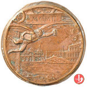 5° Esposizione d'Arte in Venezia 1903 Dritto: entro fronde di alloro: QVINTA ESPOSIZIONE al centro entro cartiglio: TIZIANO INTERNAZIONALE D'ARTE E TIEPOLO NELLA CITTA' DI VENEZIA 1903 E GIAMBELLINO Figura femminile, volta a sx, su prua di gondola regge corona di alloro sul capo di tre giovani, sullo sfondo il Palazzo Ducale e Piazza San Marco busti appaiati e affrontati di quattro figure femminili suonano tube e reggono calice, piatto e stola sullo sfondo la Basilica di San Marco | |