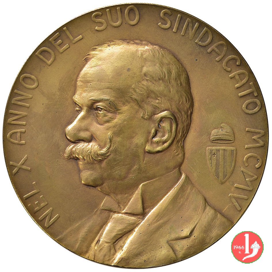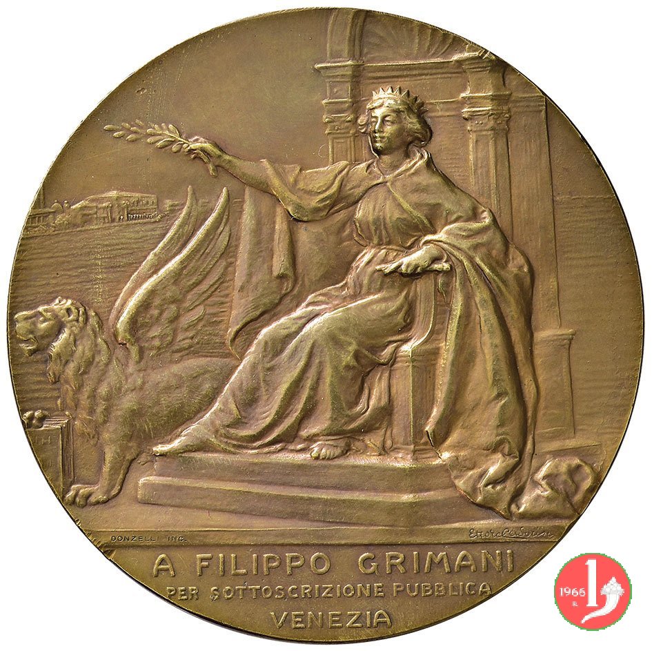 Filippo Grimani 1905 Dritto: NEL X ANNO DEL SUO SINDACATO MCMV busto a sx con baffi, camicia, giacca e cravatta nel campo, a dx: Stemma sormontato da corno dogale sulla linea dell'esergo: DONZELLI INC. _ ETTORE CADORIN in esergo: A FILIPPO GRIMANI = PER SOTTOSCRIZIONE PUBBLICA = VENEZIA | |