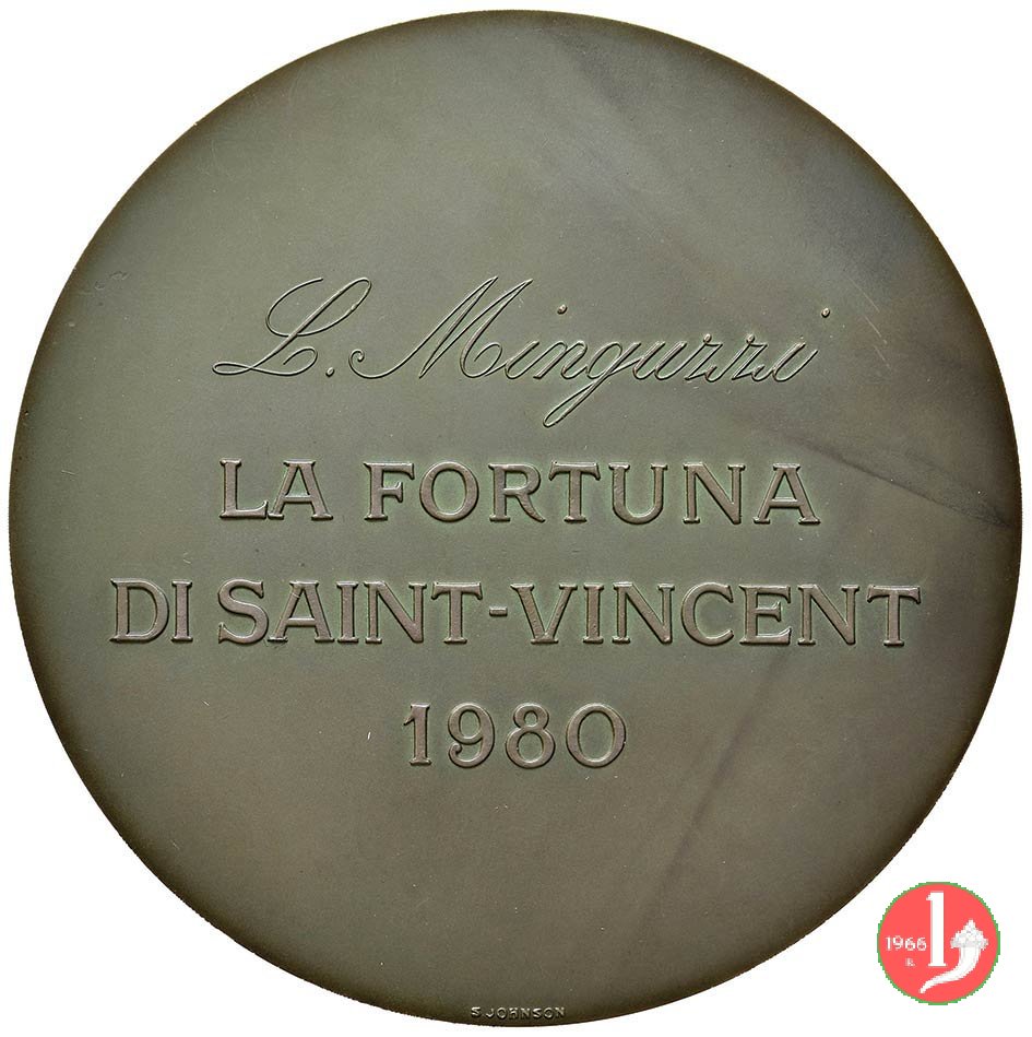 La Fortuna di Saint Vincent 1980 Dritto: Figura femminile bendata allegorica della Fortuna, danzante, regge fili tra cui numeri 7 _ 8 _ 0 _ 6 _ 1 _ 9 _ 17 in basso,a dx: MINGUZZI in basso: S. JOHNSON | |