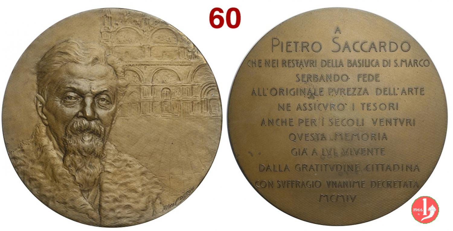 Restauro Basilica di San Marco 1904 Dritto: busto di 3/4 a dx di Pietro Saccardo con cappotto dal bavero di pelliccia a dx: scorcio della facciata della Basilica di San Marco in basso, a dx: ETTORE CADORIN a sx, presso il bordo: S.J. | |