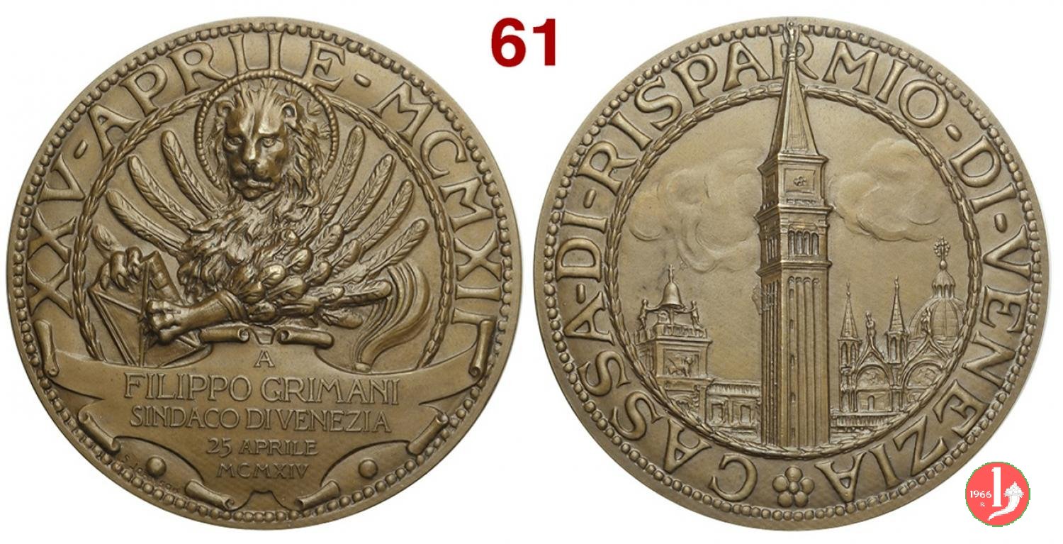 Cassa di Risparmio di Venezia a Filippo Grimani 25-04-1914 Dritto: XXV - APRILE - MCMXII Leone di San Marco entro semicerchio di calici floreali in basso entro cartiglio: A = FILIPPO GRIMANI = SINDACO DI VENEZIA = 25 APRILE = MCMXIV in basso a sx: S. JOHNSON Campanile di San Marco tra la torre dell'Orologio e la Basilica entro cerchio di calici floreali | |