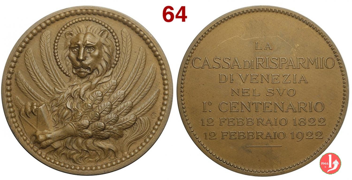 100° Cassa di Risparmio di Venezia 1922 Dritto: Leone di San Marco, nimbato ed ad ali spiegate di fronte, regge Vangelo in basso a dx monogramma: ES in basso: S.J. | |