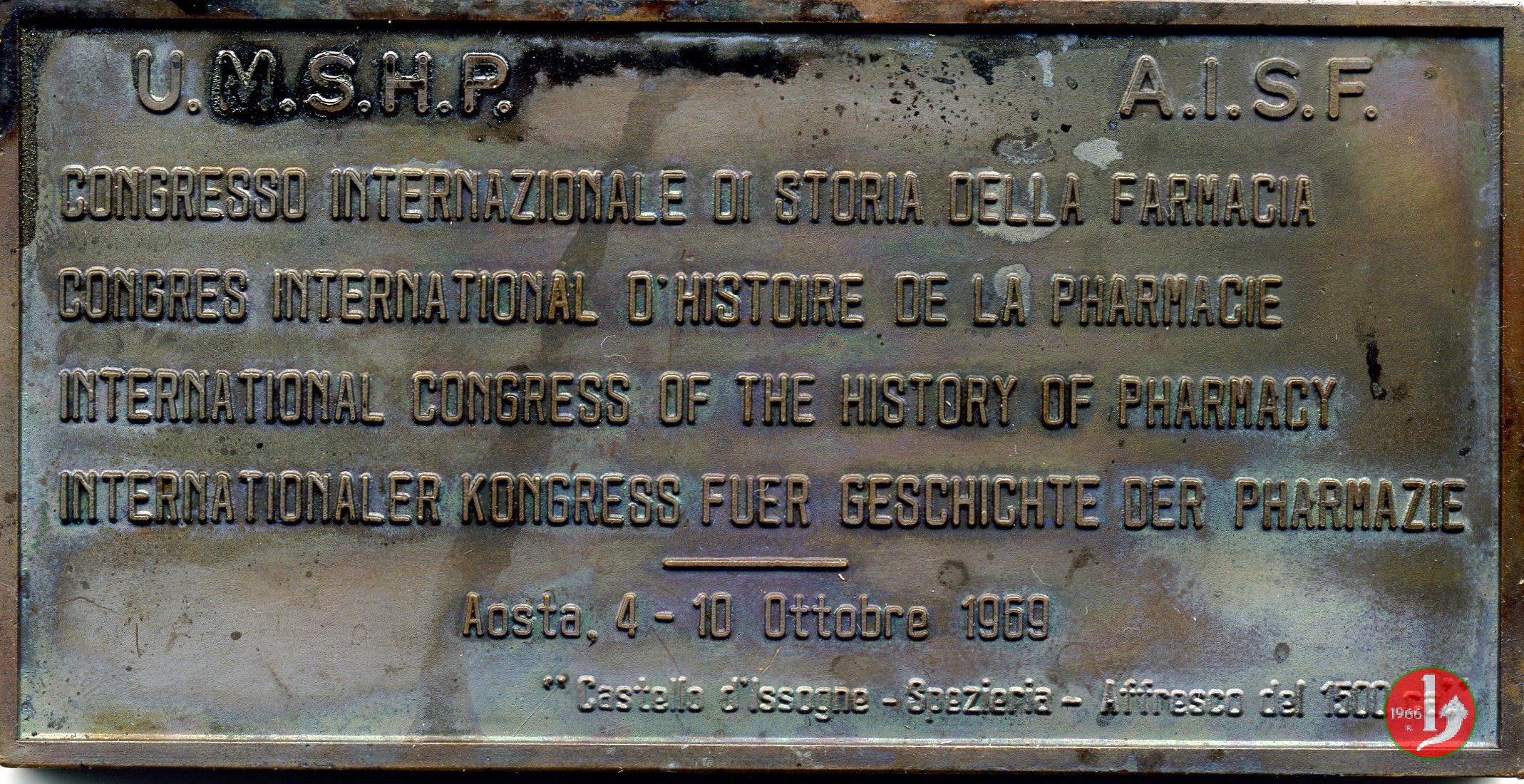 Congresso Storia della Farmacia 1969 Dritto: interno di antica Spezieria rinascimentale, riproduzione dell'affresco citato al verso Verso: nel campo in alto: U.M.S.H.P. _ A.I.S.F. nel campo: CONGRESSO INTERNAZIONALE DI STORIA DELLA FARMACIA = CONGRES INTERNATIONAL D'HISTOIRE DE LA PHARMACIE = INTERNATIONAL CONGRESS OF THE HISTORY OF PHARMACIE = INTERNATIONALER KONGRESS FUER GESCHICHTE DER PARMAZIE = - = AOSTA, 4-10 OTOOBRE 1969 in basso,a dx: "CASTELLO D'ISSOGNE - SPEZIERIA - AFFRESCO DEL 1500 C.A." | |