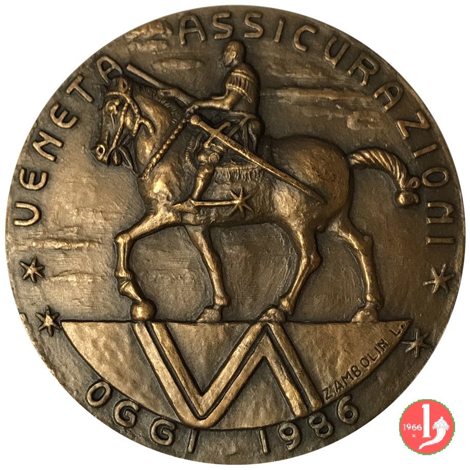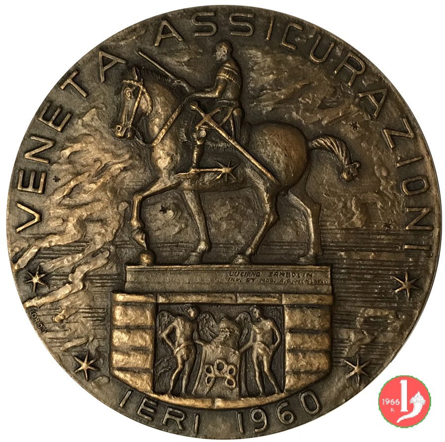 Veneta Assicurazioni 1986 Dritto: * VENETA ASSICURAZIONI * = * IERI 1960 * Il Monumento equestre ad Erasmo da Narni detto il Gattamelata, opera di Donatello, volto verso sx, posto in Piazza del Santo a Padova, con il suo basamento Il Monumento equestre ad Erasmo da Narni detto il Gattamelata, opera di Donatello, volto verso sx, posto in Piazza del Santo a Padova con basamento recante il logo della Veneta Assicurazioni: VA | |