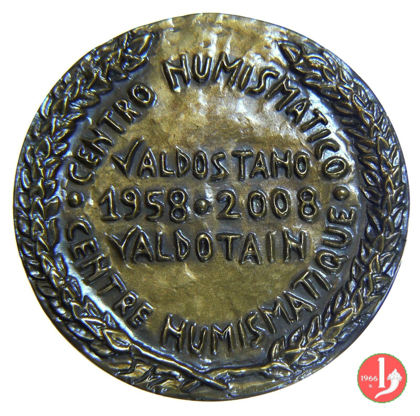 50° Centro Numismatico Valdostano 2008 Dritto: AVGVSTA • PRAETORIA • SALASSORVM Vista dell'Arco di Augusto e delle Mura romane in basso a dx: SM CENTRO NUMISMATICO = • CENTRE NUMISMATIQUE nel campo: VALDOSTANO = 1958 • 2008 = VALDOTAIN | |