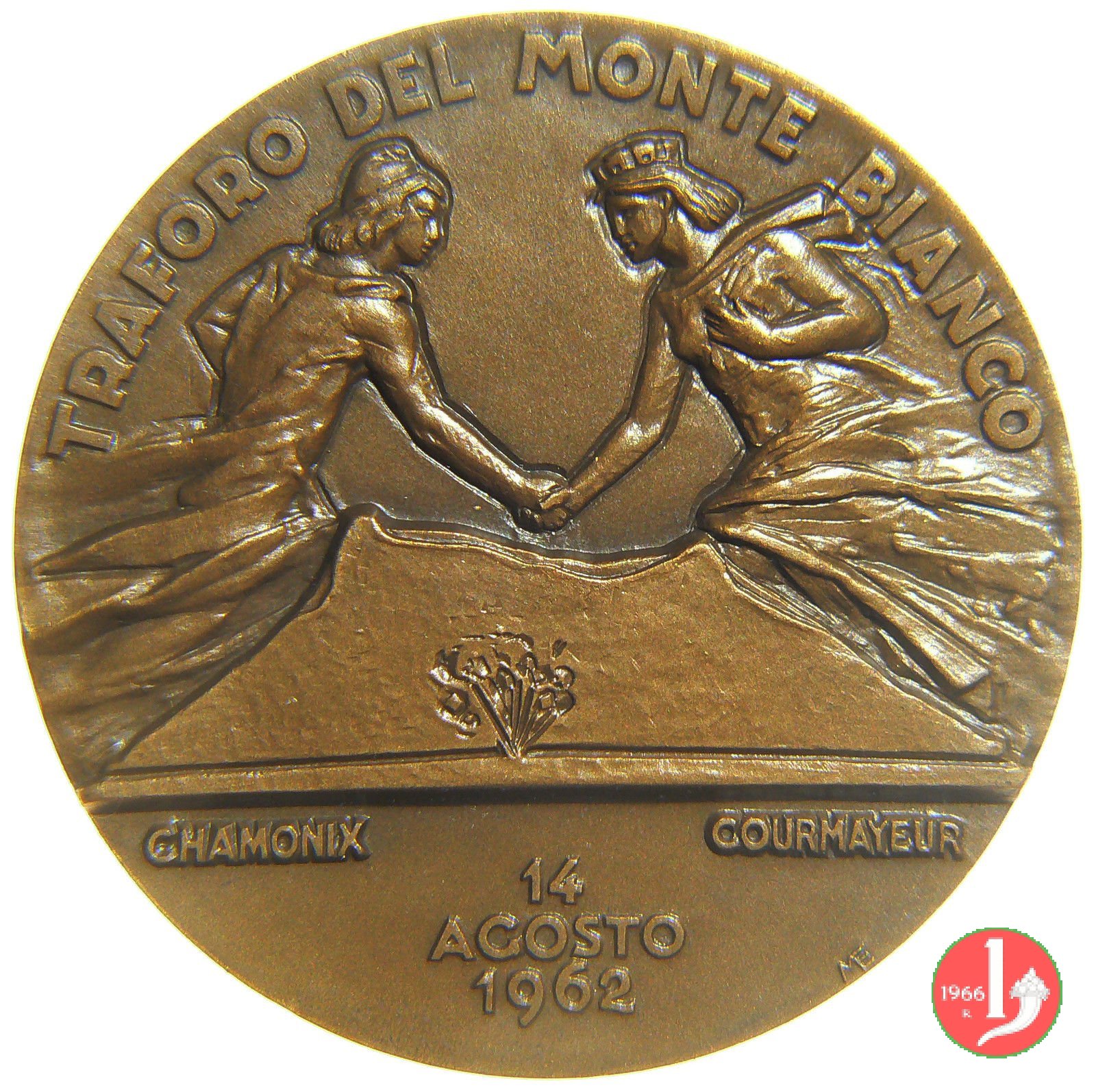Traforo del Monte Bianco 1962 Dritto: TRAFORO DEL MONTE BIANCO le figure allegoriche della Francia con berretto frigio e dell'Italia turrita, si stringono la mano su mazzo di fiori in esergo: CHAMONIX _ COURMAYEUR = 14 = AGOSTO = 1962 in basso, a dx: ME in basso: S. JOHNSON | |