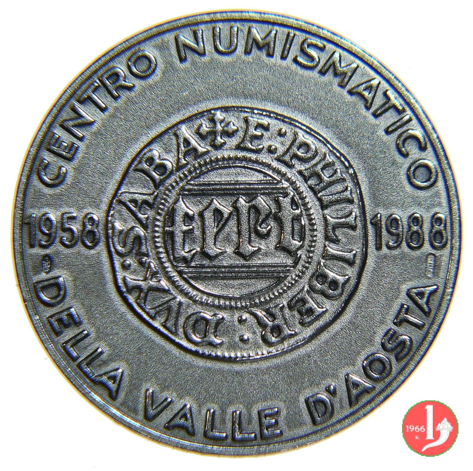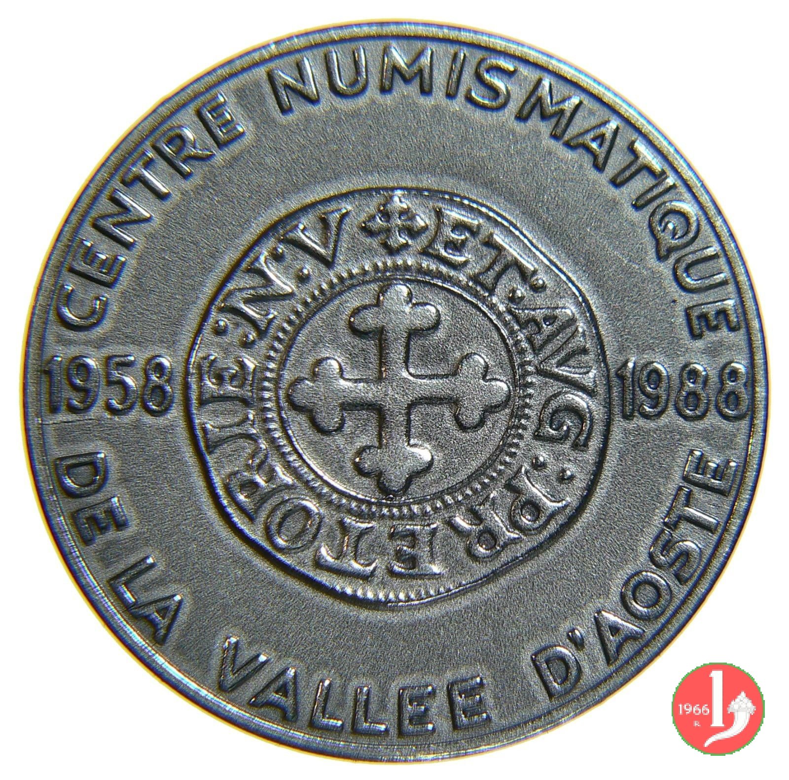 30° Centro Numismatico Valdostano 1988 Dritto: CENTRO NUMISMATICO = DELLA VALLE D'AOSTA nel campo: riproduzione del quarto di Grosso di Aosta per Emanuele Filiberto (1580) E al centro, entro cerchio perlinato: FERT tra nastri orizzontali ai lati: 1958 _ 1988 nel campo: riproduzione del quarto di Grosso di Aosta per Emanuele Filiberto (1580) ET al centro, entro cerchio perlinato: Croce rinforzata ai lati: 1958 _ 1988 | |