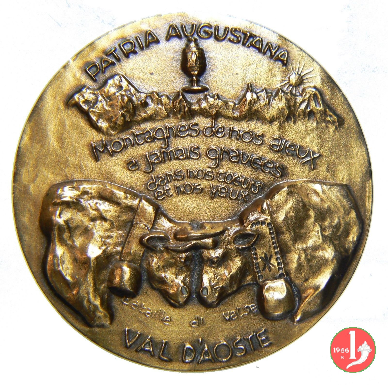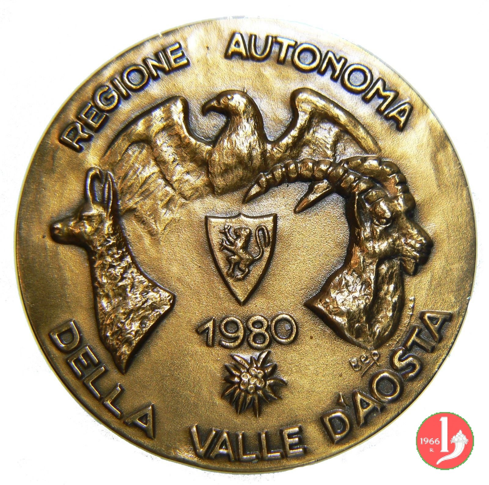 Regione Autonoma della Valle d'Aosta 1980 Dritto: REGIONE AUTONOMA = DELLA VALLE D'AOSTA Aquila ad ali spiegate sullo stemma della valle d'Aosta tra le teste di capriolo e stambecco sotto: 1980 = stella alpina in basso a dx: BEP Urma e sole tra montagne MONTAGNES DES NOS AIEUX = A JAMAIS GRAVEES = DANS NOS COEURS = ET NOS VEUX Vacche con campanacci con teste affrontate sotto: BATAILLE DI VALSE in basso: VAL D'AOSTE | |