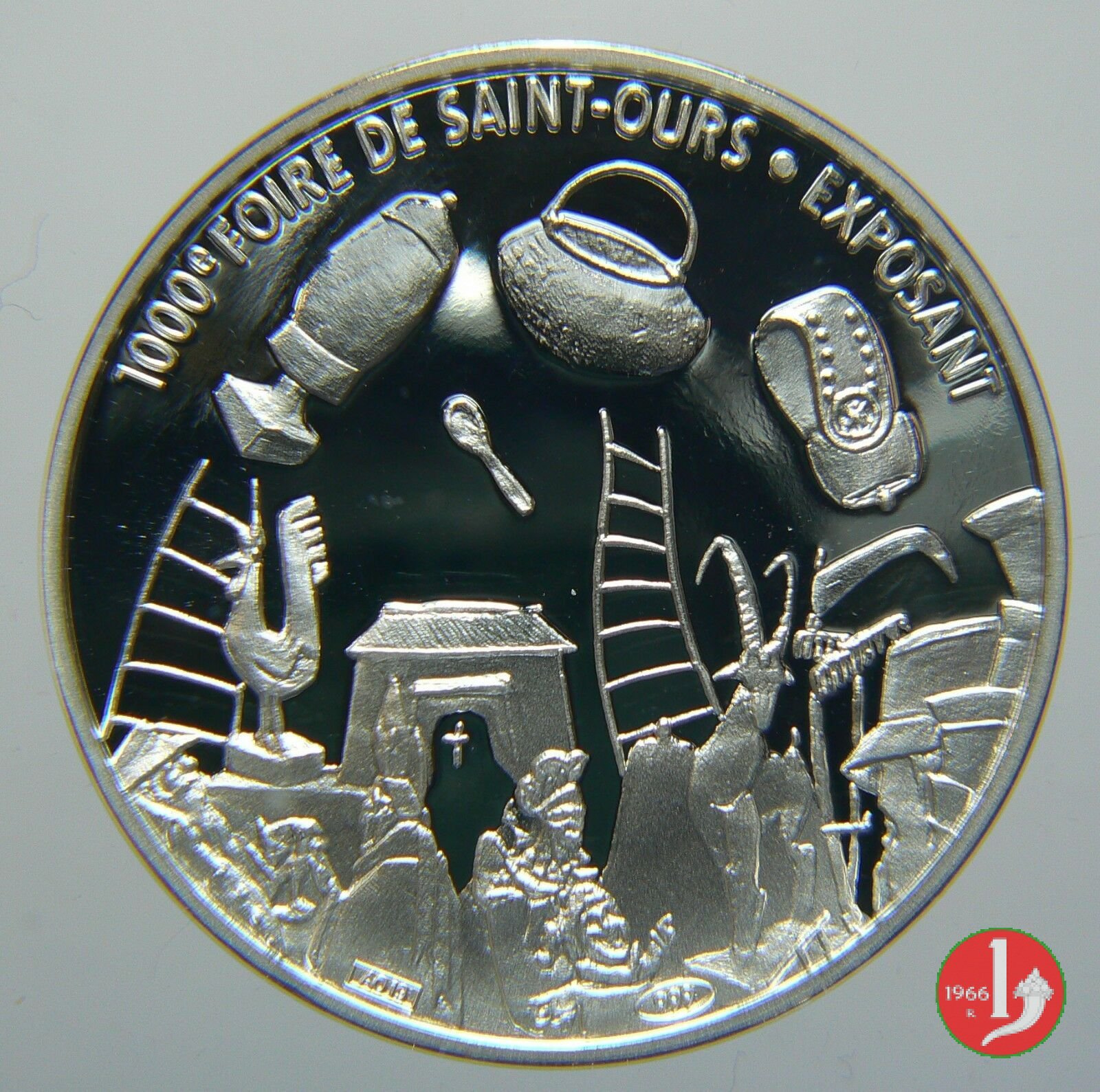 1000° Fiera di Sant'Orso 2000 Dritto: riproduzione di denaro viennese medioevale: S • MAVRICIVS • ✠ • entro cerchio perlinato: testa elmata a sx Grolla, stambecco e scale tra vari attrezzi, presso l'Arco di Augusto | |