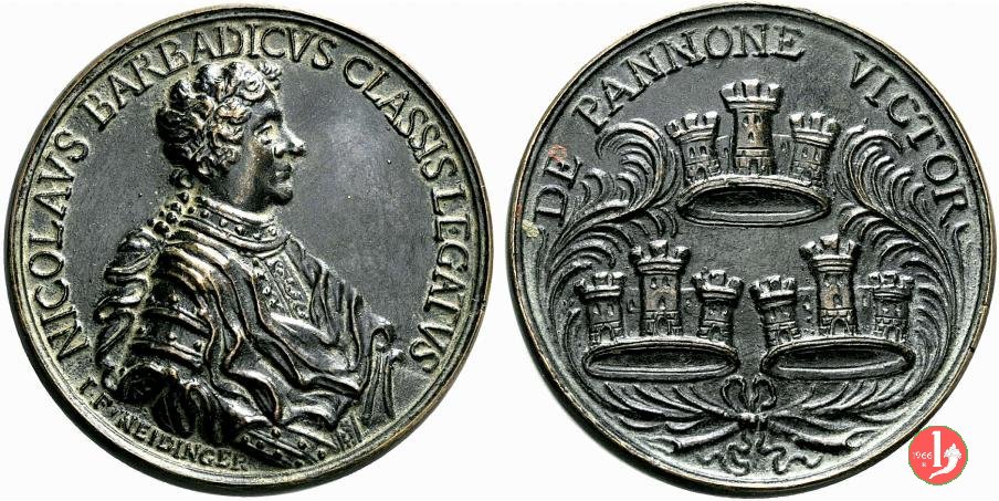 Nicolo Barbarigo -V1246 Dritto: NICOLAVS BARBADICVS CLASSIS LEGATVS busto a dx con corazza e mantello sotto: F • P • NEIDINGER entro rami di palma, legati in basso da nastro: tre corone turrite | |