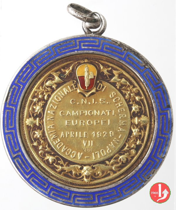 Accademia Nazionale Scherma Napoli -C101 Obverse: guerriero medioevale con armatura regge scudo e spada e sullo sfondo castello con torrione Reverse: entro cornice di fregi floreali con mascherone in basso e sormontato da stemma con fascio su campo giallo e amaranto: ACCADEMIA NAZIONALE DI SCHERMA NAPOLI nel campo: C.N.I.S. = CAMPIONATI = EUROPEI = APRILE 1929 = VII | |