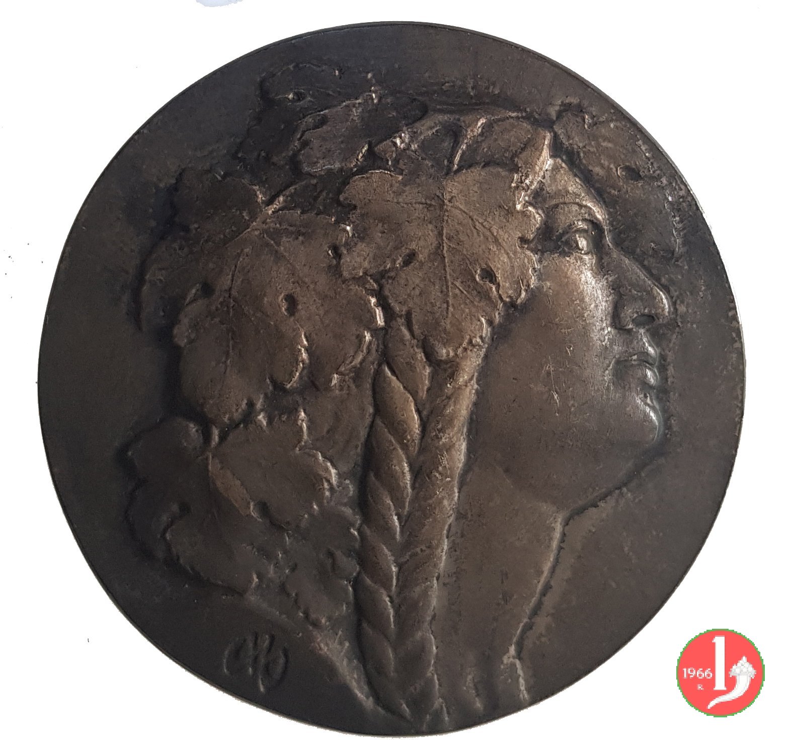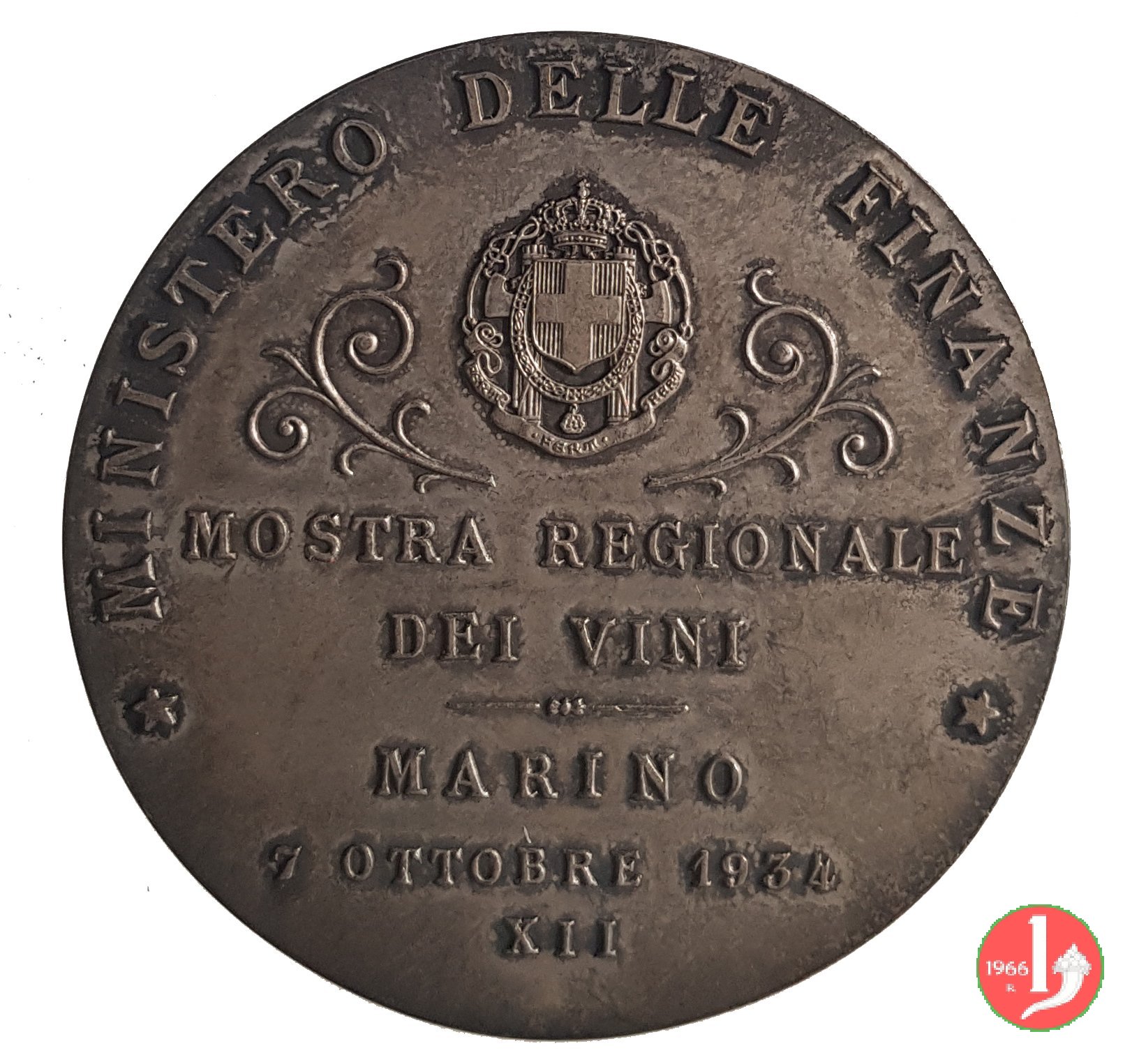 Ministero delle Finanze - Mostra Vini a Marino 1934 -C- Obverse: busto a dx di figura allegorica con tralcio d'uva tra i capelli sul taglio spalla: monogramma nel campo, sotto a Stemma coronato tra nodi d'amore e fasci verticali a lame divergenti, posto tra due fregi a volute: MOSTRA REGIONALE = DEI VINI = - = MARINO = 7 OTTOBRE 1934 = XII | |