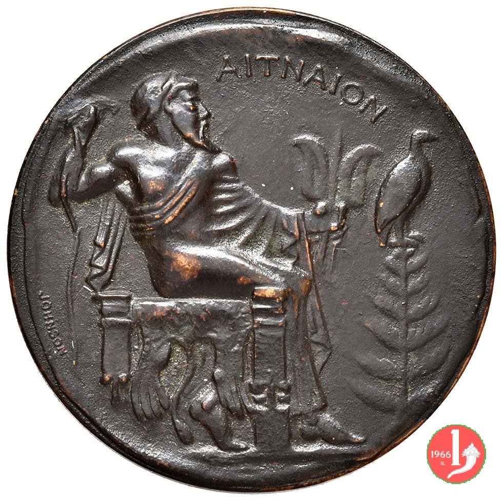 Consorzio Strada Etna -C- Obverse: AITNAION Riproduzione del tetradramma di Aitna con la rappresentazione di Zeus Aitnaios, protettore del vulcano Etna, seduto verso dx, regge tralcio di vite e fulmine alato, a dx aquila su albero d'abete in basso a sx: JOHNSON Vista di Catania e sullo sfondo l'Etna fumante sotto a dx: BRVNO = LOCATELLI in esergo: OB • VIAM = AD • AETNAE • VERTICEM • DVCENTEM = VICTORIO • EMANVELE • III • REGE = PERFECTAM = A • D • 1934 • XI • E.F. | |