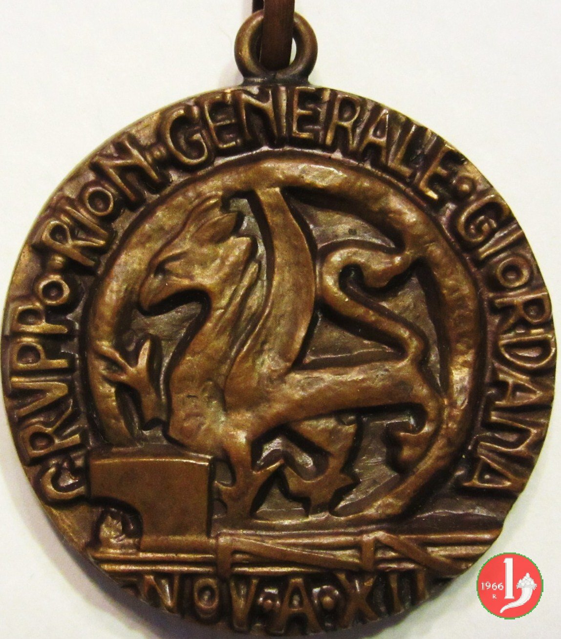 Gruppo Rionale Generale Giordana -C- Obverse: CREDERE _ OBBEDIRE _ COMBATTERE quattro bandiere al vento affisse alla sommità di muro ai lati: NVOVA _ SEDE in basso: A.G. SANTAGATA Grifone a sx entro ghirlanda e su fascio orizzontale in esergo: NOV • A • XII | |