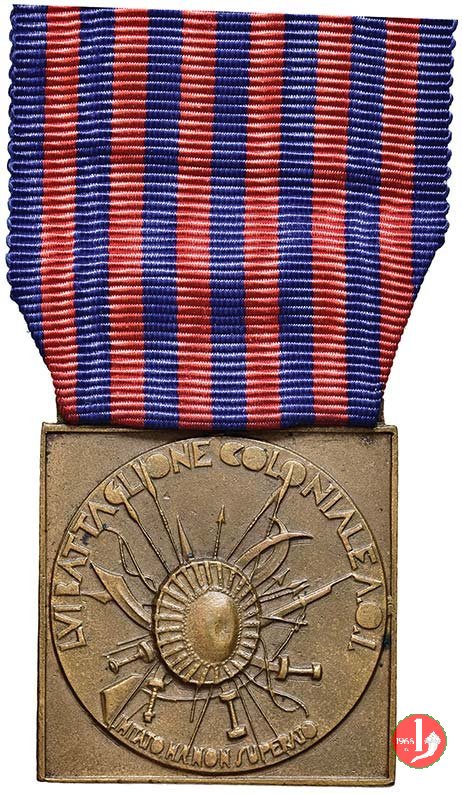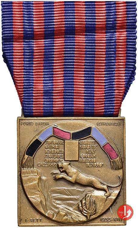 Verso: nel campo tra trofeo, lance etiopi e rami di quercia: TRIPOLITANIA = CIRENAICA = FRONTIERA • ORIENTALE = A.O.I. = ADDIS • ABEBA=FICCE = MUCHER • MORED = MARABATIE