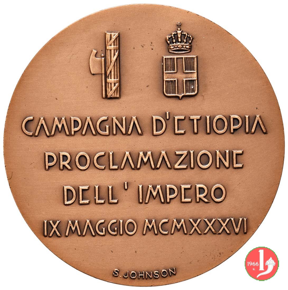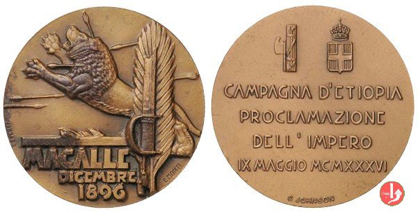 Proclamazione dell'Impero-Badoglio e Graziani Obverse: in alto: APRILE = XIV carro armato, su fascio, con cingoli sollevati e con la legenda: BADOGLIO = GRAZIANI in primo piano: leone volto a dx in basso, a dx: E. MONTI in basso, a sx: JOHNSON nel campo: CAMPAGNA D'ETIOPIA = PROCLAMAZIONE = DELL'IMPERO = IX MAGGIO MCMXXXVI in basso: S. JOHNSON |