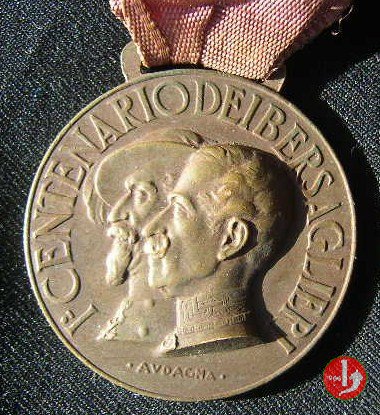 I°Centenario dei Bersaglieri -C- Obverse: I° CENTENARIO DEI BERSAGLIERI busti accollati a sx del Gen. la Marmora e di Carlo Alberto in uniforme sotto: • AVDAGNA • trofeo dell'Armata con miccia accesa tra corni, su fucili decussati e fascio orizzontale sotto: A XIV. ai lati: Stemma Savoia e Stemma di Torino in basso: GL | |