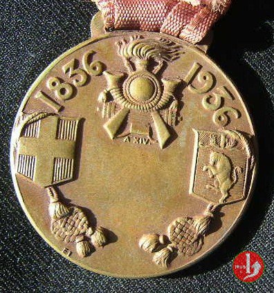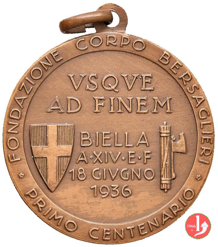 La Marmora - 100° Bersaglieri Biella 1936 -C- Obverse: ALESSANDRO LAMARMORA CREATORE DEI BERSAGLIERI = • TORINO 1799 - KADIKOI 1855 • busto a sx con cappello piumato e divisa con decorazioni nel campo a sx: AD nel campo: VSQVE = AD FINEM Tra stemma crociato a scudetto e fascio verticale: BIELLA = A • XIV • E • F = 18 GIVGNO = 1936 | |