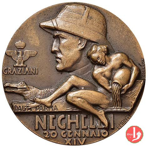 Graziani Neghelli -C137 Obverse: busto a sx di Neghelli con cappello in basso figura allegorica distesa versa acqua da otre e sullo sfondo alligatore volto a sx nel campo a sx: Aquila coronata ad ali spiegate = GRAZIANI sulla linea dell'esergo a sx: DAUA PARMA in esergo: NEGHELLI = 20 GENNAIO = XIV a dx, presso il bordo: JOHNSON in basso, a dx: E. MONTI ai lati: 1936 _ 1896 a dx, presso il bordo: JOHNSON in esergo: AMBA • ALAGI = A • XIV | |