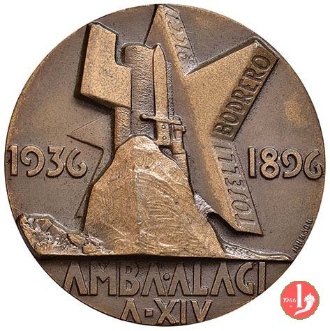 Proclamazione dell'Impero-Amba Alagi Obverse: fascio infisso in sperone roccioso su stella ai lati: 1936 _ 1896 in esergo: AMBA • ALAGI = A • XIV nel campo: CAMPAGNA D'ETIOPIA = PROCLAMAZIONE = DELL'IMPERO = IX MAGGIO MCMXXXVI in basso: S. JOHNSON | |