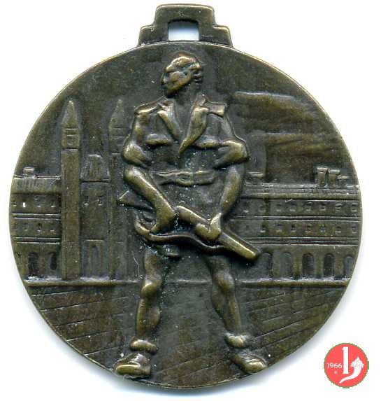 Brigata Parma Vecchia Obverse: Partigiano in piedi di fronte con edificio alle spalle Reverse: ramo di quercia nel campo, in alto, a sx: AI VALOROSI = GIOVANI = PARMENSI DEL = FRONTE DI = RESISTENZA = GLORIOSI nel campo, a dx: LIBERATORI = BRIGATA = PARMA = VECCHIA in basso: BERTONI MILANO | |